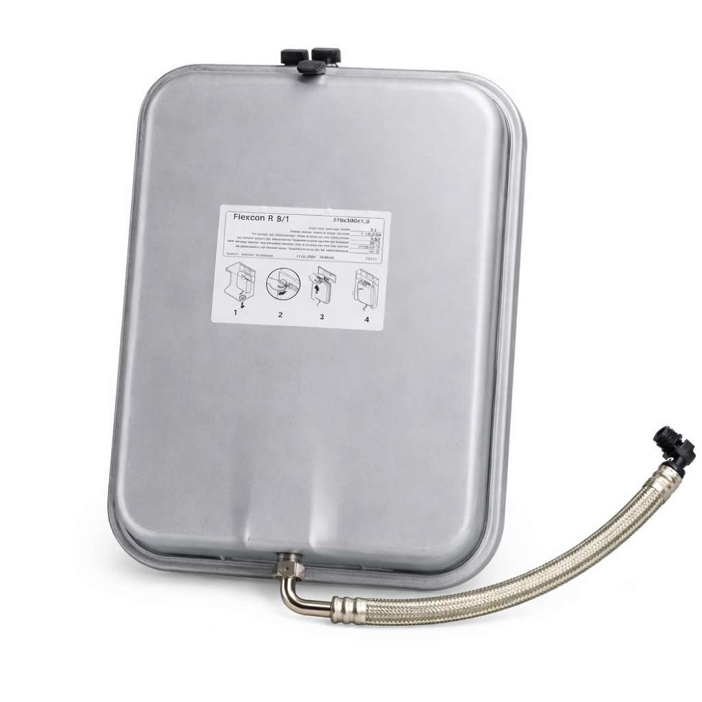 Oryginalne naczynie wzbiorcze 8L De Dietrich o numerze katalogowym 7600525 przeznaczone do kotłów gazowych kondensacyjnych tej marki. Element stanowi część układu hydraulicznego kotła i odpowiada za kompensację zmian objętości wody w instalacji centralnego ogrzewania.